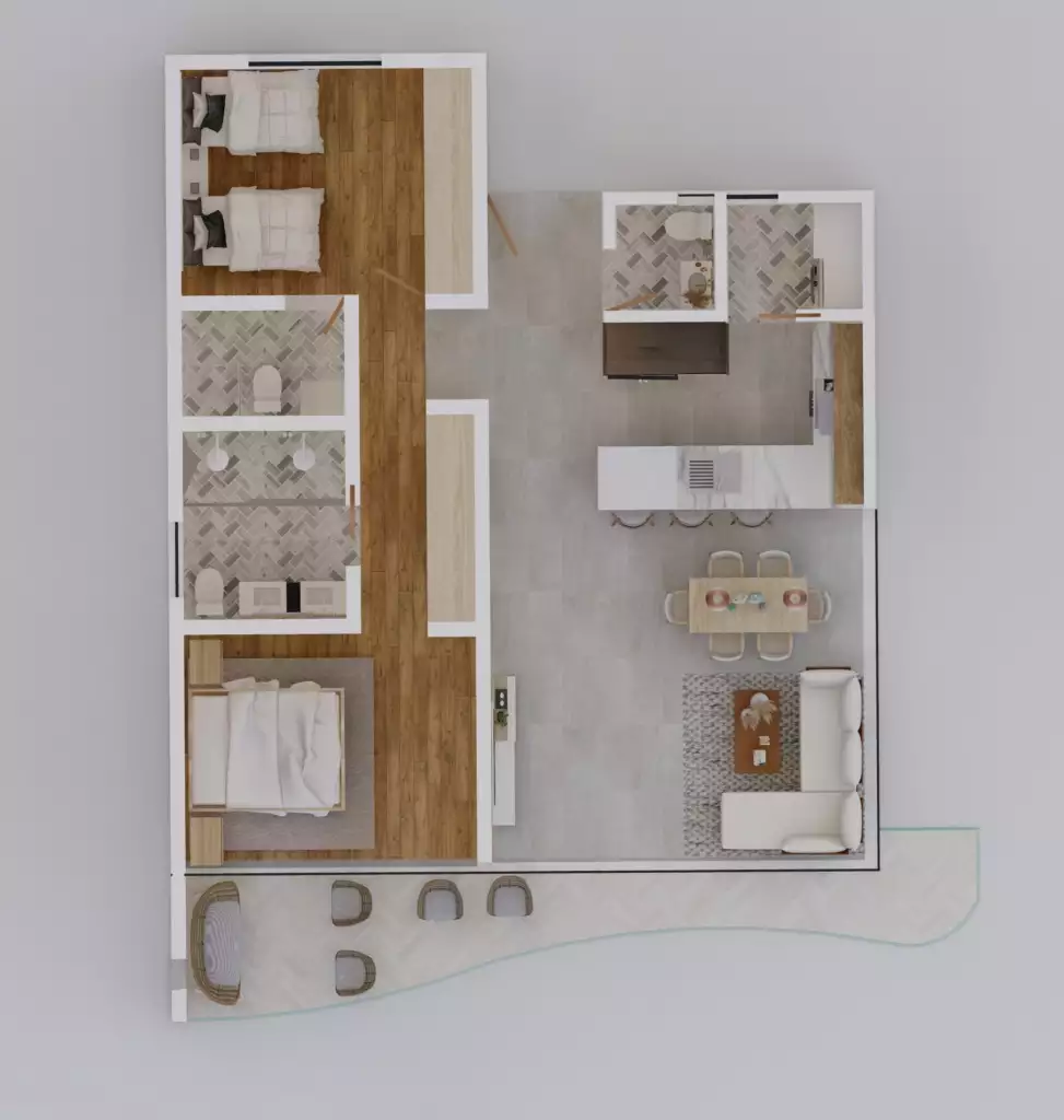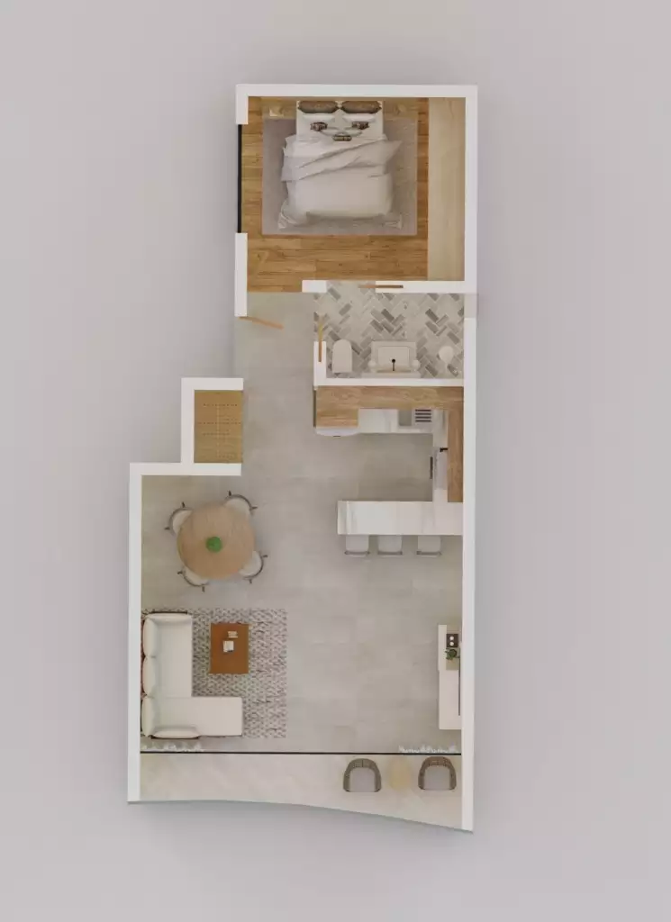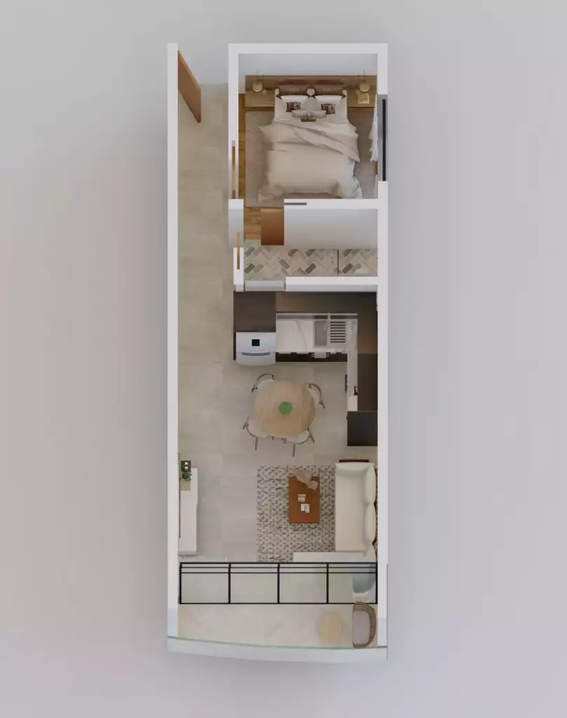 Estos apartamentos en 55 metros cuadrados cuentan con una cocina, un dormitorio, un baño, también una sala-comedor, un balcon y su propia area de lavado.
