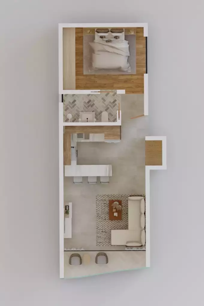 Estos apartamentos en 50 metros cuadrados cuentan con una cocina, un dormitorio, un baño, también una sala-comedor y un balcon.